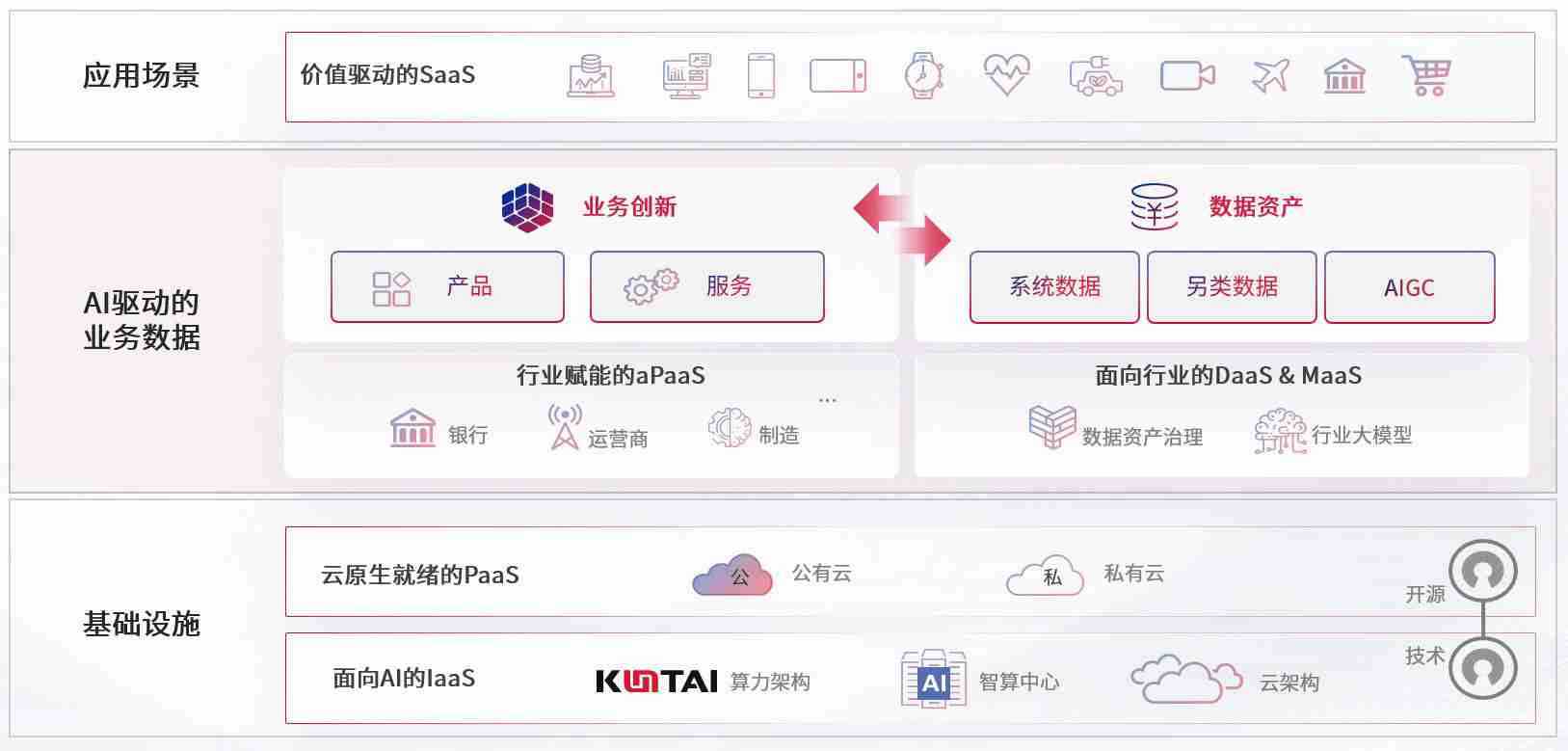 在基础设施层面,,基于商业或开源的云原生就绪开发工具与技术组件(PaaS)和面向AI的底层公共基础设施资源(IaaS),,,,将共同支撑企业完成数字化转型