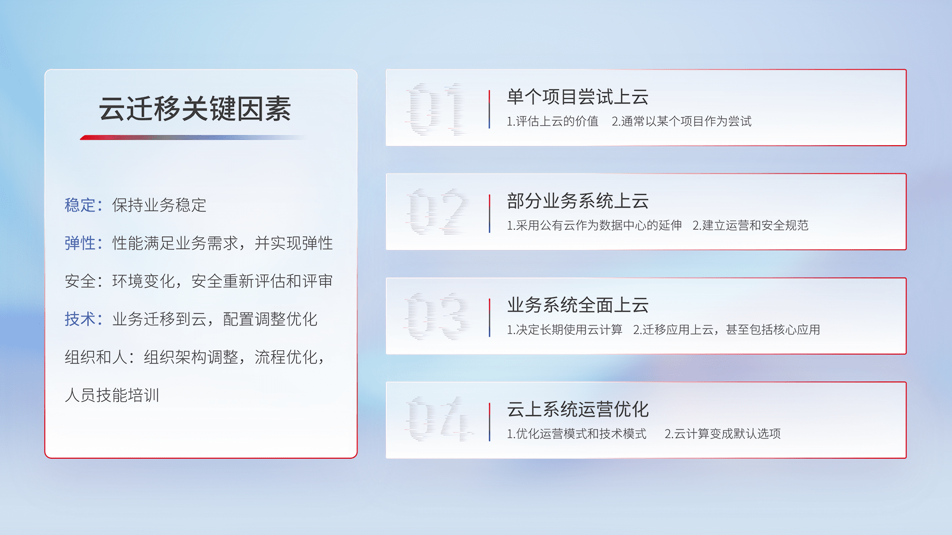 结合实际业务,,,从规划设计、、、、云平台选型、、、、云原生改造、、、、数据迁移、、、、集成交付,,,,迁移全过程为客户识别最佳上云路径,,,,做好风险识别管理,,,,设计网络架构、、、、身份权限、、、安全审计合规、、操作审计、、、、日志审计、、、监控告警策略、、多站点容灾设计等,,,对云上基础设施进行整体规划,,,,提升IT治理水平,,,,以满足弹性、、、高可用、、、高性能的需求。。。