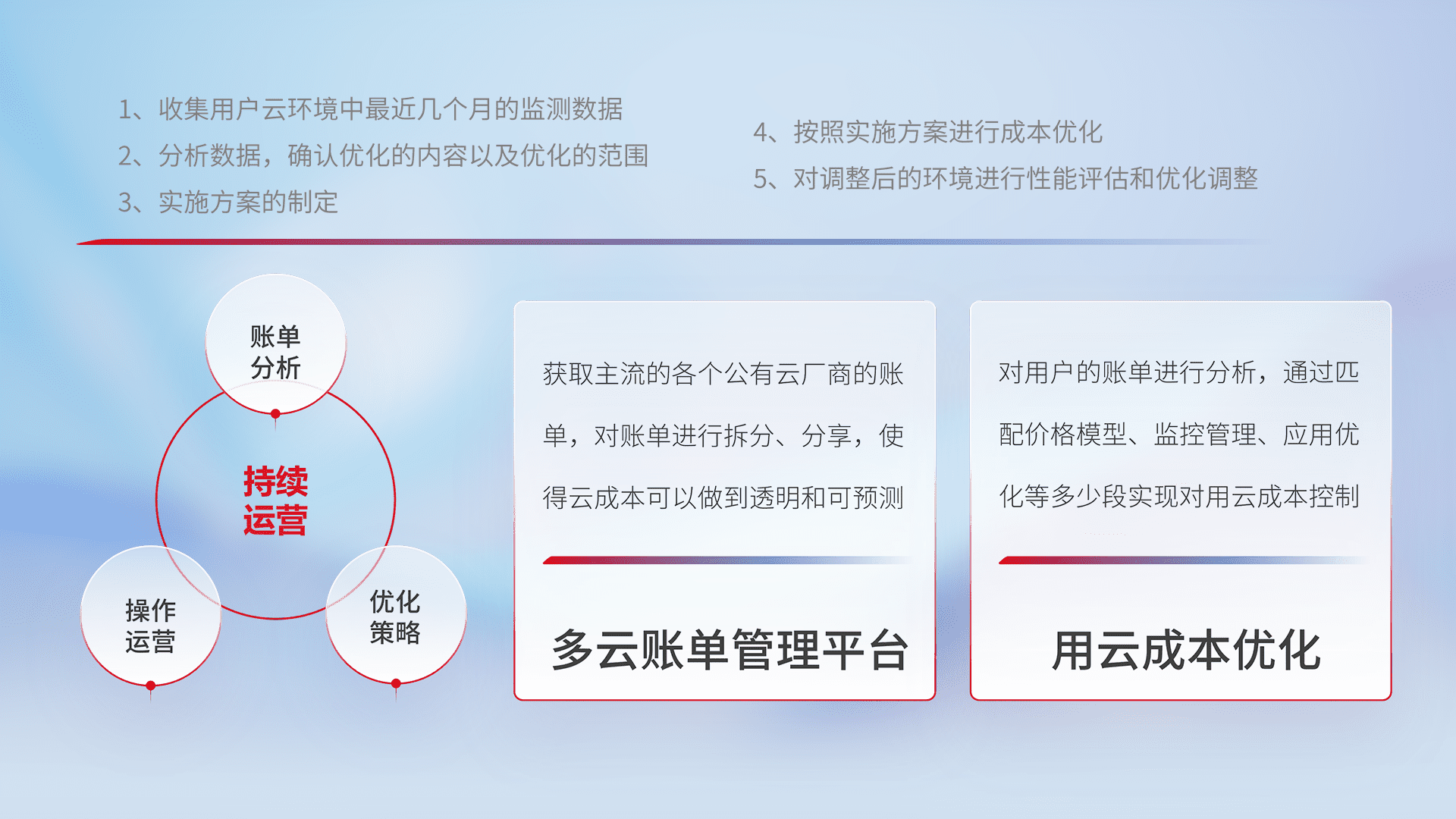 通过多云纳管,,,,以统一的资源数据模型把客户的云资源进行抽象和封装,,进而实现对多云资源的统一操作,,,,保障云资源管理的可靠性、、、稳定性与可用性。。量身定制化运维内容,,,,配置、、、、开发运维、、、补丁管理、、、备份、、、监控、、认证和访问管理、、、审计和日常巡检等,,保障在用云过程中的可靠度,,,稳定度以及高可用率。。
